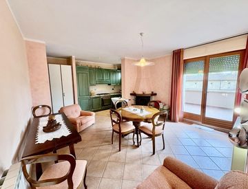 L'appartamento è composto da ampio soggiorno con cucinotto e caminetto, ripostiglio, disimpegno con camera matrimoniale e bagno con finestra. Dalla zona living si accede ad una gradevole terrazza abitabile. Dispone inoltre di una soffitta al piano superiore, accessibile dal vano scala, e di e comodo garage al piano seminterrato.