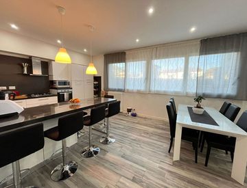 L’immobile si apre su una suggestiva zona giorno doppia con angolo cottura dotato di penisola, un ambiente che si presta perfettamente per momenti conviviali, con con una bellissima vetrata di 5mt che dona alla stanza una piacevole luce, troviamo poi tre belle camere matrimoniali, un ampio ripostiglio adibito a zona lavanderia e doppi servizi.