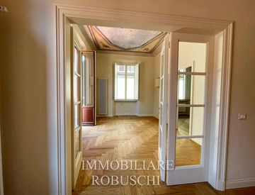 L'appartamento presenta soffitti affrescati, pavimenti in parquet pregiato e si compone di un doppio soggiorno con un raffinato camino, una sala da pranzo, una cucina abitabile, tre camere da letto, due bagni e una stanza multiuso.