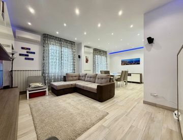 La distribuzione degli ambienti è razionale e funzionale: la zona giorno si sviluppa in una ampia area living con sala doppia e cucina a vista, ideale per la vita quotidiana e per momenti conviviali. La zona notte è composta da due camere matrimoniali, ben dimensionate e silenziose, e da un bagno finestrato.