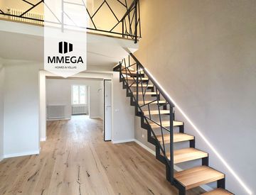 L’ingresso introduce a una scenografica zona giorno, composta da un’ampia sala da pranzo con cucinotto e da un luminoso soggiorno impreziosito da un elegante soppalco, che ospita una zona di servizio con lavanderia, perfettamente integrata negli spazi.