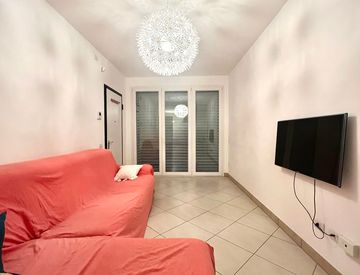 L'appartamento è composto da grande zona giorno con cucina a vista attrezzata e balcone, camera matrimoniale con ampio armadio, camera con 2 letti singoli, bagno completo con doccia, ripostiglio con lavatrice.