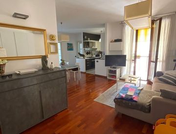 L'appartamento, dotato di ascensore, è posto al secondo piano ed è composto da ingresso e ampia zona giorno openspace con cucinotto e balcone vivibile; una camera che è divisa dalla zona giorno con due porte scorrevoli e si può ususfruire come terza camera da letto oppure come prolungamento della zona giorno; altre due camere matrimoniali di cui una con cabina armadio e due bagni entrambi finestrati.