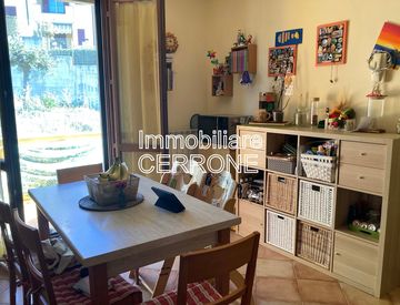 L'appartamento si compone di una zona soggiorno/cucina con terrazzo pranzabile, una camera attualmente adibita a sala, un bagno con box doccia, e poi un disimpegno dal quale, tramite una scala a chiocciola, si accede al locale sottotetto nel quale trovano spazio una camera matrimoniale, una cameretta ed infine un secondo bagno.