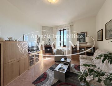 La zona giorno, luminosa e accogliente, è composta da soggiorno-pranzo con angolo cottura su misura e camino angolare, da cui si gode una suggestiva vista panoramica sulla pianura pisana. La zona notte comprende una camera matrimoniale, una camerina, un bagno finestrato con doccia e un comodo ripostiglio.