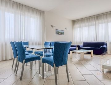 L’ingresso accoglie in un’ariosa zona living, perfettamente illuminata dalla luce naturale e collegata alla terrazza fronte mare, ideale per momenti di relax o convivialità all’aperto. La cucina, comoda e ben organizzata, gode anch’essa dell’accesso diretto alla terrazza.