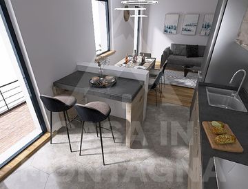 La distribuzione interna prevede un luminoso soggiorno con angolo cottura, due balconi panoramici esposti a sud, una camera matrimoniale, una seconda camera doppia e un bagno moderno.