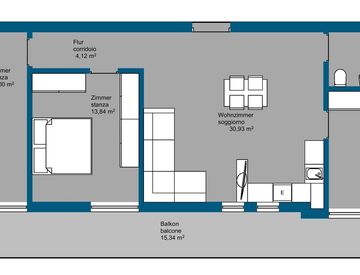 L'appartamento si trova al 3° piano di un edificio ben tenuto, comodamente raggiungibile con l'ascensore. Particolarmente degno di nota è l'ampio balcone esposto a sud-ovest, che offre sole tutto il giorno: un luogo ideale per trascorrere ore di relax all'aria aperta.