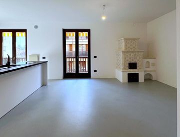 L’ingresso conduce a un ampio e accogliente soggiorno, impreziosito da una stufa ad olle che dona carattere e comfort all’ambiente. Il soggiorno, così come la cucina a vista moderna, gode di accesso diretto al balcone, creando un piacevole collegamento tra interno ed esterno e rendendo la zona giorno particolarmente ariosa e vivibile.