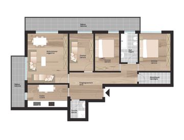 L'appartamento è composto da un ingresso, un soggiorno accogliente, una cucina, tre camere da letto, un ripostiglio, due balconi e due bagni.