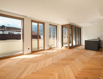 Rivolta verso il lato est l’appartamento dispone di due camere da letto con accesso diretto a una terrazza di circa 20 m². Il soggiorno con cucina aperta si apre sulla loggia coperta lato ovest. Completano l’unità un bagno e un WC separato.