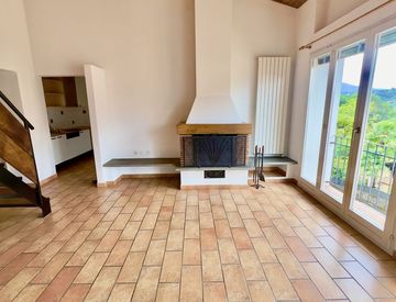 La zona giorno, situata al piano inferiore, è caratterizzata da un’ampia cucina abitabile, un luminoso soggiorno con camino e ampie vetrate con vista panoramica sui monti circostanti.