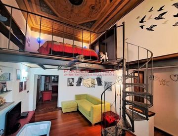 Ingresso open-space con altissimi soffitti con travi in legno, caminetto, zona pranzo e un primo soppalco sul quale si sviluppa la cucina. Sotto al soppalco si trova il bagno con doccia. A seguire troviamo una zona soggiorno con un bellissimo alto soffitto lavorato e un secondo soppalco sul quale si sviluppa la zona notte in un’atmosfera molto intima e accogliente. Dal soggiorno si accede ad un comodo ripostiglio che completa l’appartamento.