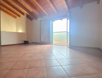 La grande terrazza a tasca regala una vista aperta e rappresenta il luogo perfetto per godere di un caffè al mattino o di un aperitivo al tramonto. La camera matrimoniale è accogliente e dotata di armadi a muro, mentre il bagno è completo di vasca e doccia, offrendo tutto il comfort necessario.
