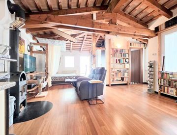 L'appartamento si trova al primo e ultimo piano della palazzina e ci accoglie in una zona giorno molto funzionale e ben organizzata con cucina a vista e angolo pranzo/studio. Alla sua destra si apre la zona notte, corredata da un'ampia armadiatura a muro e potenzialmente divisibile creando un cartongesso. Le travi a vista e il parquet dei pavimenti impreziosiscono questo ambiente che colpisce per la sua luminosità grazie a diversi punti luce.