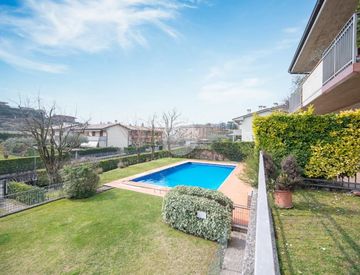 All'interno di un elegante residence con piscina, immerso nelle colline del lago e comodissimo ai campi da Golf, appartamento piano terra con porticato.