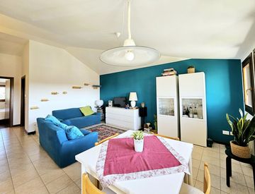 L'abitazione, ben tenuta e studiata nei dettagli, offre uno spazio abitativo raffinato con un'elegante zona giorno caratterizzata da ingresso, soggiorno e cucina parzialmente separata con affaccio su un balcone.