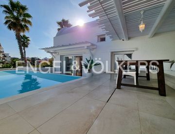 Dalla grande terrazza con piscina privata e pompeiana si accede alla luminosa zona living, che comunica con una moderna cucina abitabile e con una seconda terrazza in cui è possibile far colazione con vista sulla piscina riscaldata e circondata da palme e sabbia bianchissima.