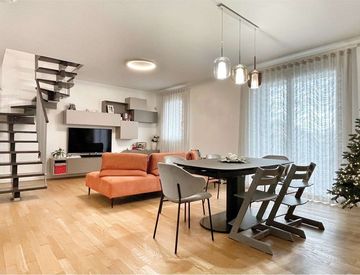 In zona residenziale tranquilla e centrale in piccolo condominio dal disegno innovativo. Appartamento in duplex dalle grandi dimensioni. Composto al piano inferiore da zona giorno di oltre 45 mq, due comode terrazze, bagno e camera matrimoniali. Sottotetto organizzato con due camere e bagno. Garage doppio al piano interrato. Libero per autunno 2026.