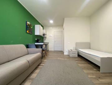 MONOCALE COMPLETAMENTE NUOVO Si entra nell'open space con l'angolo cottura completo di piano ad induzione per la cottura dei cibi, del frigo con piccolo freezer e del forno. In dotazione anche tutti gli utensili da cucina (pentole, posate, piatti, etc. ). Un letto singolo, armadio capiente e un divano letto matrimoniale e un tavolo con le sedie e una smart Tv. Il bagno è completo di tutti i sanitari e di una grande doccia. Illumina l'immobile una...