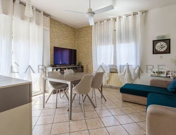La soluzione si distingue per un ampio e luminoso soggiorno, valorizzato dall’accesso al primo terrazzo e ben separato dalla cucina abitabile, garantendo ambienti funzionali e ben organizzati.