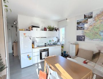 L'appartamento accoglie con un ingresso funzionale che conduce al soggiorno open space con cucina a vista moderna dalle linee essenziali e luminose grazie alle grandi finestre doppio vetro bianche. La zona giorno è arricchita da un poggiolo spazioso ideale per colazioni o momenti di relax all'aperto, dove poter godere della tranquillità del quartiere circondati dal verde urbano.