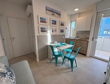 L'immobile è composto da una camera da letto matrimoniale, una camera con un letto a castello, un bagno finestrato con box doccia e un soggiorno cucina.