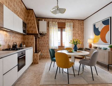 Arriviamo subito nella cucina, abitabile, dove è presente un caminetto a oggi solo decorativo, ma che si può recuperare con l'adeguamento della canna fumaria.