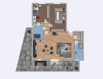 L'appartamento si compone di ampio soggiorno che risulta essere molto luminoso che dà accesso alla terrazza abitabile e cucina separabile. La zona notte è così composta: una camera doppia, una camera singola e due bagni completi.