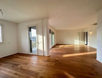 TREVISO fuori mura, palazzina di nuova costruzione di sole 7 unità abitative fronte fiume, appartamento al secondo piano con terrazze loggiate esposte a est/ovest, servito da ascensore, composto da soggiorno cottura di 50 mq, disimpegno, tre camere, due bagni, due ripostigli, garage e posto auto. Riscaldamento a pavimento, pannelli fotovoltaici, aria condizionata, pavimentazione in legno. Cl. A4 ipe 50. Euro 390.000. - STUDIO IMMOBILMARCA - RIF. 5...