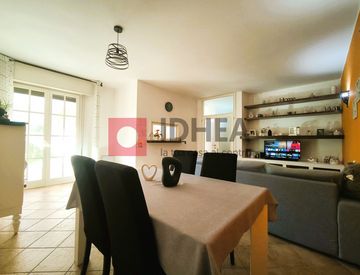 dall'ingresso si accede al luminoso soggiorno di 24 mq e cucina abitabile di 12 mq, entrambi con accesso diretto sul giardino caratterizzato da un'alta siepe che garantisce relax e privacy; ripostiglio con scaffalatura, ampio disimpegno con armadiatura a 6 ante che conduce alla zona notte dove troviamo una camera matrimoniale di ben 17 mq con bagno padronale finestrato, due camere doppie di 13,5 mq e 11,5 mq, e bagno finestrato.