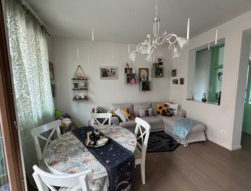 Entrando al primo piano, si viene accolti da una porta blindata che garantisce sicurezza. La zona giorno ampia è caratterizzata da una comoda area pranzo e un divano angolare, mentre la pratica veranda offre un affaccio sul verde circostante. La cucina, graziosa e dotata di porta scorrevole, regala una vista sul giardino condominiale, rendendo ogni momento culinario un'esperienza unica.
