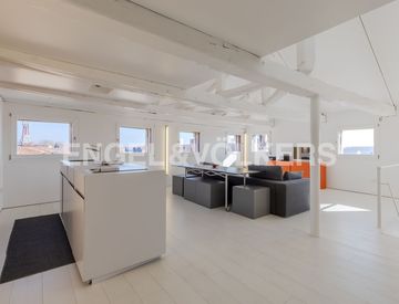 Ci troviamo in Campo dell'Arsenale, sede dello storico Arsenale di Venezia, un tempo cuore della potenza navale della città. Ci emoziona immaginare che proprio qui, per secoli, veniva costruita e mantenuta la flotta veneziana, dando forma al dominio della Repubblica sui mari. L'ingresso del nostro appartamento si trova al secondo piano e, una volta varcata la porta, un'altra rampa di scale ci conduce allo splendido loft: uno spazio che bilancia perfettamente...