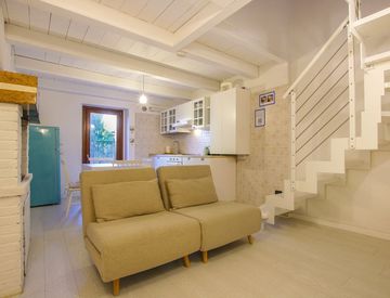 Al piano rialzato troviamo la zona giorno, composta da un soggiorno con angolo cottura e un camino che dona calore e atmosfera, perfetto per serate confortevoli.