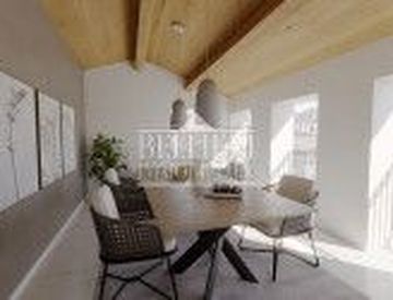 L'appartamento è rifinito con materiale di alta qualità e vanta di un design moderno e funzionale, caratterizzato da uno scenografico soffitto con travi a vista.