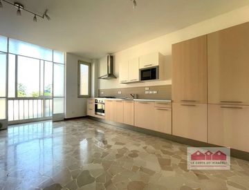 Con una metratura di 100 mq. è composto da ingresso, grande soggiorno con zona pranzo, cucina separata, semi-abitabile e completamente arredata, due camere, un bagno completo con doccia ed un bagno ospiti. Terrazza verandata dal lato cucina e terrazza abitabile dal lato salone. Cantina, grande soffitta e posto interno per le biciclette, garage. Finiture armoniose e curate, aria condizionata canalizzata. Termo autonomo.