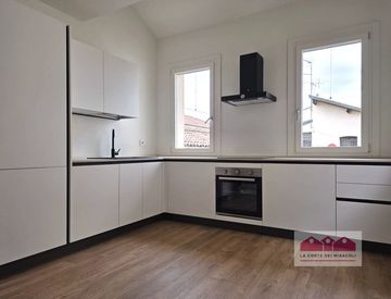 L’ingresso introduce a una luminosa cucina con angolo cottura di nuova installazione, completo di lavastoviglie, forno, piano a induzione e frigorifero con freezer. Le finiture contemporanee e gli impianti nuovi garantiscono massima funzionalità e risparmio energetico. La zona giorno continua poi sul una sala da pranzo/soggiorno.