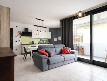 L’ingresso, tramite portoncino blindato, si apre direttamente sulla luminosa zona giorno composta da angolo cottura e area living ben distribuita, uno spazio accogliente e funzionale pensato per garantire comfort e praticità nella vita quotidiana. Dalla zona giorno si accede alla terrazza, ideale per momenti di relax all’aperto, con piacevole affaccio sul giardino condominiale che dona tranquillità e riservatezza.