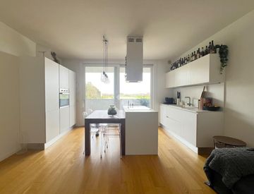 L'ingresso si apre su una luminosa zona giorno openspace con cucina e soggiorno, valorizzata da un'ampia vetrata che permette l'accesso diretto al terrazzo, dal quale si gode di una piacevole vista aperta.