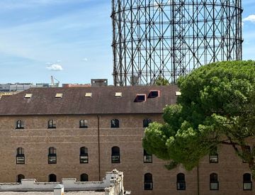 L’ingresso spazioso con armadi a muro accoglie gli ospiti in modo elegante. La zona living ampia e luminosa è caratterizzata da tre vetrate scorrevoli esposte a sud, che offrono una vista mozzafiato sul Gazometro, il Tevere e le storiche gru di archeologia industriale, mentre la cucina abitabile, separata da una parete in vetro, unisce profondità, funzionalità e design.