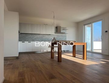 L'attico è così composto: uscendo dall'ascensore troviamo una passerella suggestiva che ci accompagna al bellissimo terrazzo esterno. Entrando nell'appartamento troviamo la cucina soggiorno di oltre 40 mq con vetrata ad est, un disimpegno, una lavanderia, un bagno e tre camere (due camere singole ed una matrimoniale).