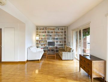 con due porte finestre che si affacciano direttamente sul terrazzo di 40 mq ca, una cucina con balcone, due camere e doppi servizi.
