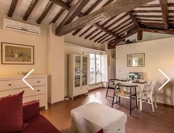 Delizioso 4 ed ultimo piano in palazzetto senza ascensore, luminoso ampio salotto pranzo con cucina a vista, armadi a muro, bagno doccia, camera da letto matrimoniale. Pavimenti in cotto, soffitti alti spioventi con travi a vista. Aria condizionata. Ben arredato con divano letto.