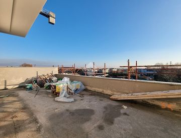 attico di 4 locali con ampia zona giorno, cucina a vista, grande terrazzo e terrazzino, disimpegno con ripostiglio, bagno, due ampie camerette con balconata, camera matrimoniale con bagno padronale e balconata angolare.