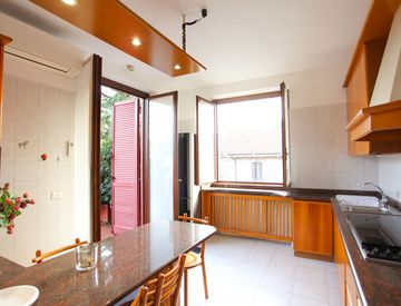 - cucina su misura in legno massello, già equipaggiata con elettrodomestici di ultima generazione (forno, microonde, frigo e lavastoviglie appena sostituiti).