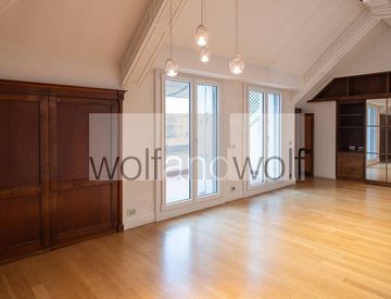 Nella prestigiosa Via Manzoni proponiamo in vendita un raro attico che guarda a 360 gradi sui tetti e i giardini del Quadrilatero di Milano.