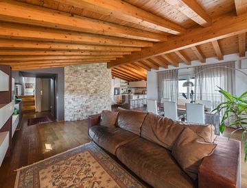 La zona giorno si sviluppa in un ambiente ampio e luminoso, caratterizzato da importanti altezze e soffitti in legno a vista, che conferiscono calore ed eleganza agli spazi.