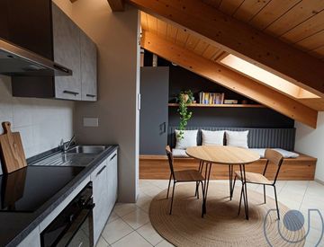 L'appartamento di recente costruzione è dotato di caldi soffitti in legno con travi a vista.