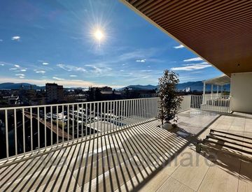 L’attico è composto da un ingresso, ampio open space con cucina a vista e soggiorno, tre camere da letto, di cui una con cabina armadio e due bagni spaziosi. Attorno all’appartamento due ampie terrazze coperte e un lastrico solare al piano superiore con area rinforzata per la possibile installazione di una piscina.