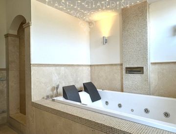 Il bagno in marmo travertino, decisamente ricercato, è uno dei punti di forza della casa: dispone di doppio lavabo, grande vasca idromassaggio per due e doccia, offrendo uno spazio di vero comfort quotidiano.